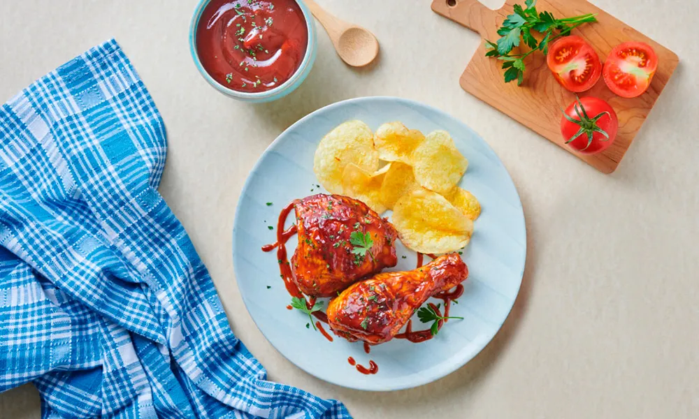Retirar del horno y servir acompañado de chips de papas y más salsa BBQ.