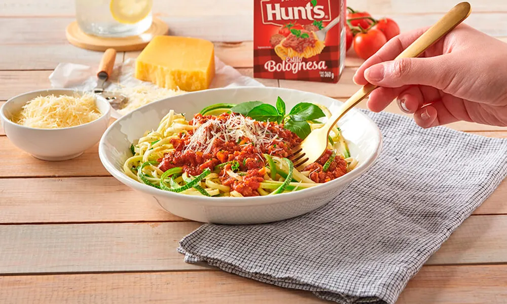 3. Sirve las espirales de calabaza con un poco de Salsa Hunt’s estilo bolognesa caliente y acompaña con queso parmesano. Decora al gusto.